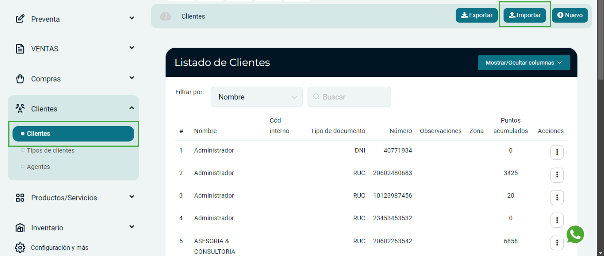 Ingresa al módulo de Clientes y luego selecciona subcategoría Clientes.En la parte superior derecha selecciona el botón Importar.