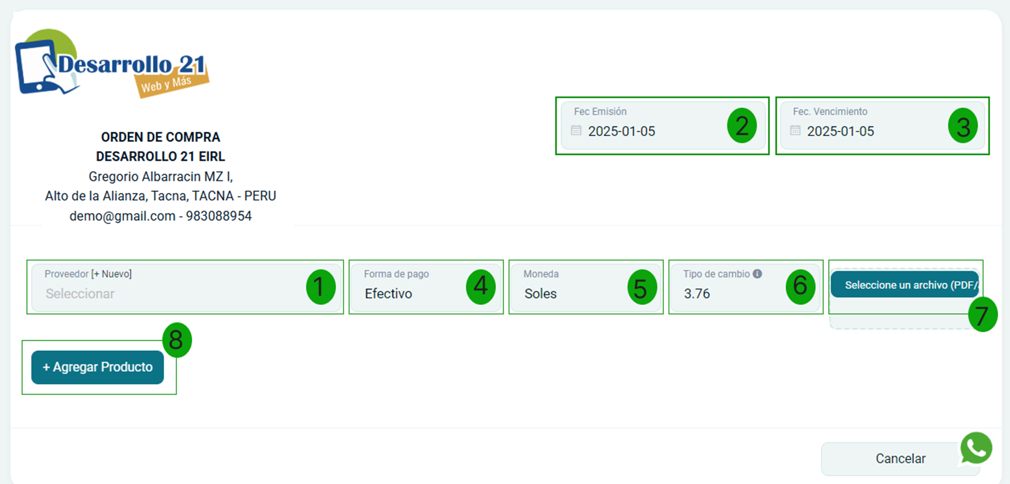 [6] - Seleccione un archivo (PDF/JPG): Selecciona un archivo que se adjuntará con la orden de compra.