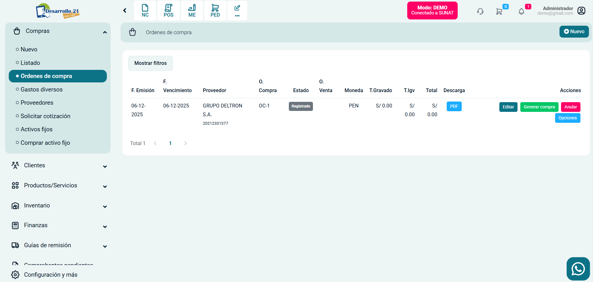 Finalmente para observar la lista de órdenes de compra, nos ubicamos nuevamente en listado.