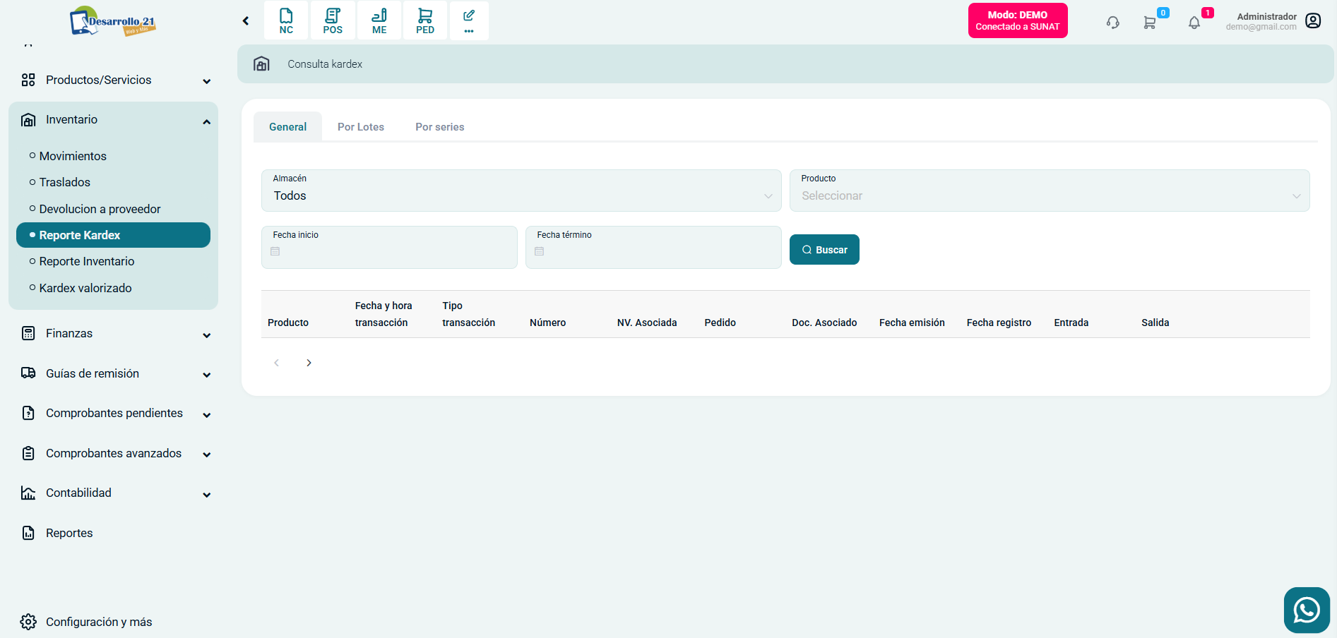En esta área te ayudaremos a revisar el reporte organizado kardex que muestra el movimiento (ingresos, salidas y a veces los ajustes) de los productos, dentro del almacén.