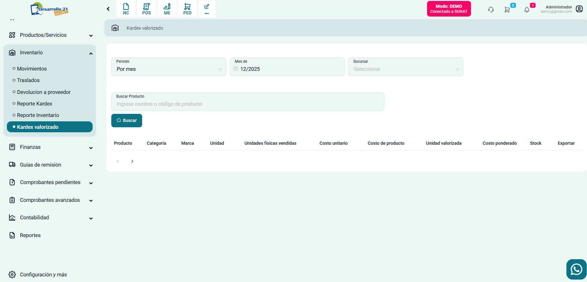 Ingresa al módulo de Inventario, luego selecciona la subcategoría Kardex valorizado.