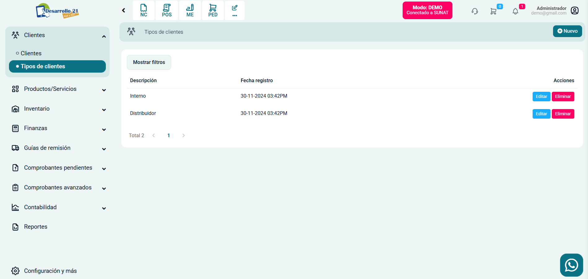 Ingresa al módulo de Clientes y luego selecciona subcategoría Tipos de clientes. Para añadir un tipo de cliente selecciona en el botón Nuevo.