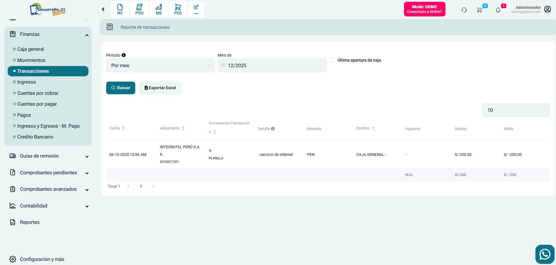 Ingresa al módulo de Finanzas y luego selecciona la subcategoría Transacciones.