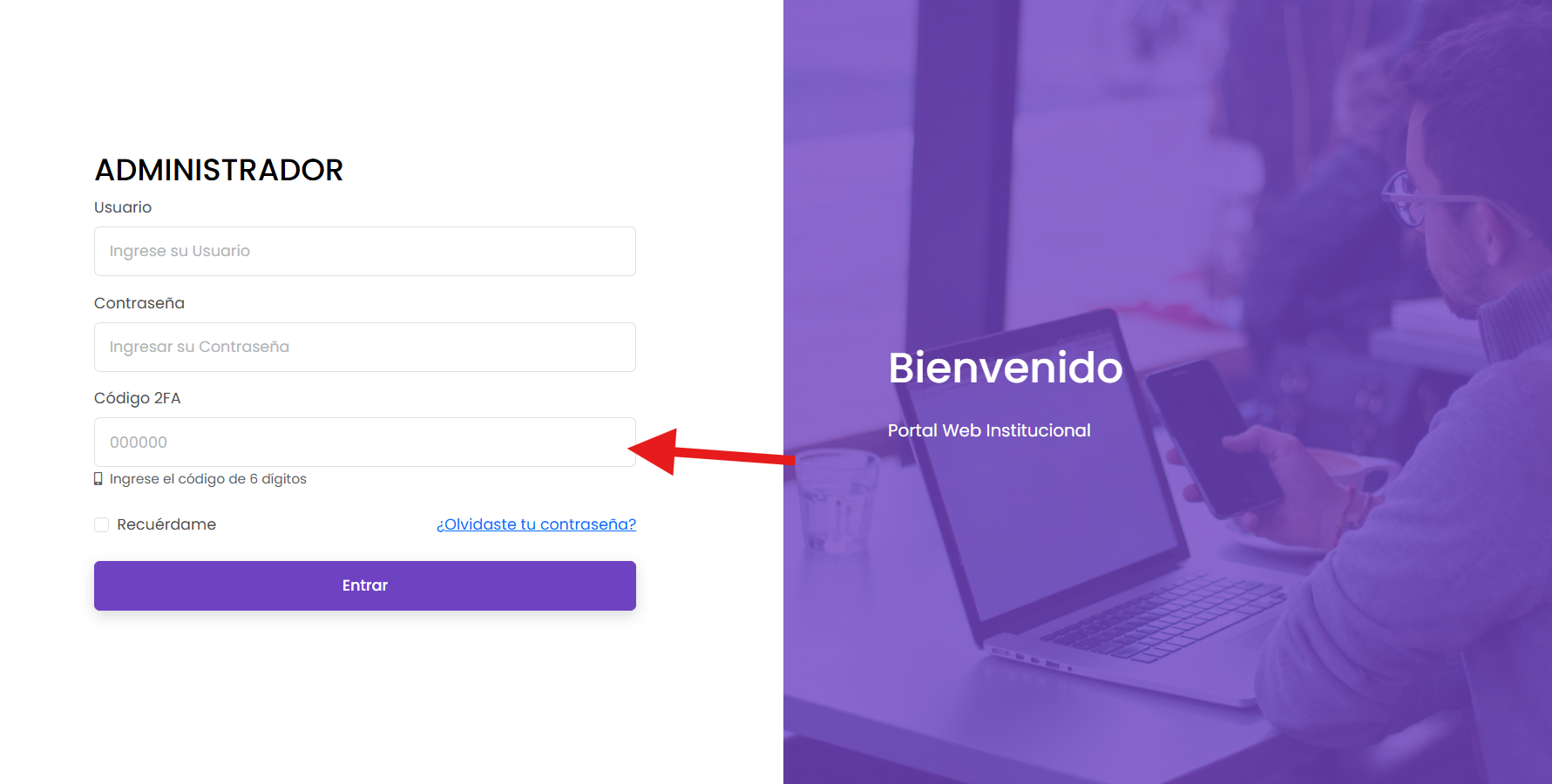 Ahora en su pagina web de wordpress deberá ingresarlo en la opción 2FA aparte del usuario y contraseña correspondiente