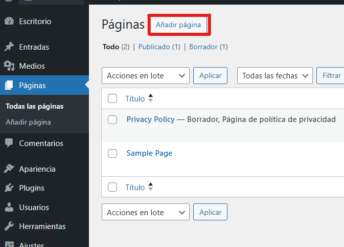 - Haz clic en "Páginas" > "Añadir nueva".