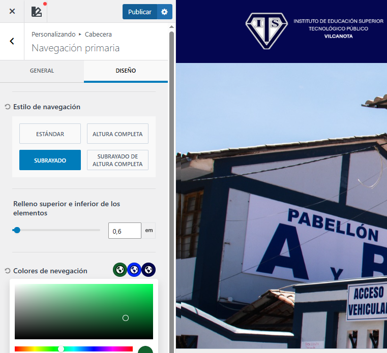 Paso 8: Si queremos cambiar el tema de la pagina web nos vamos a Colores de Navegación