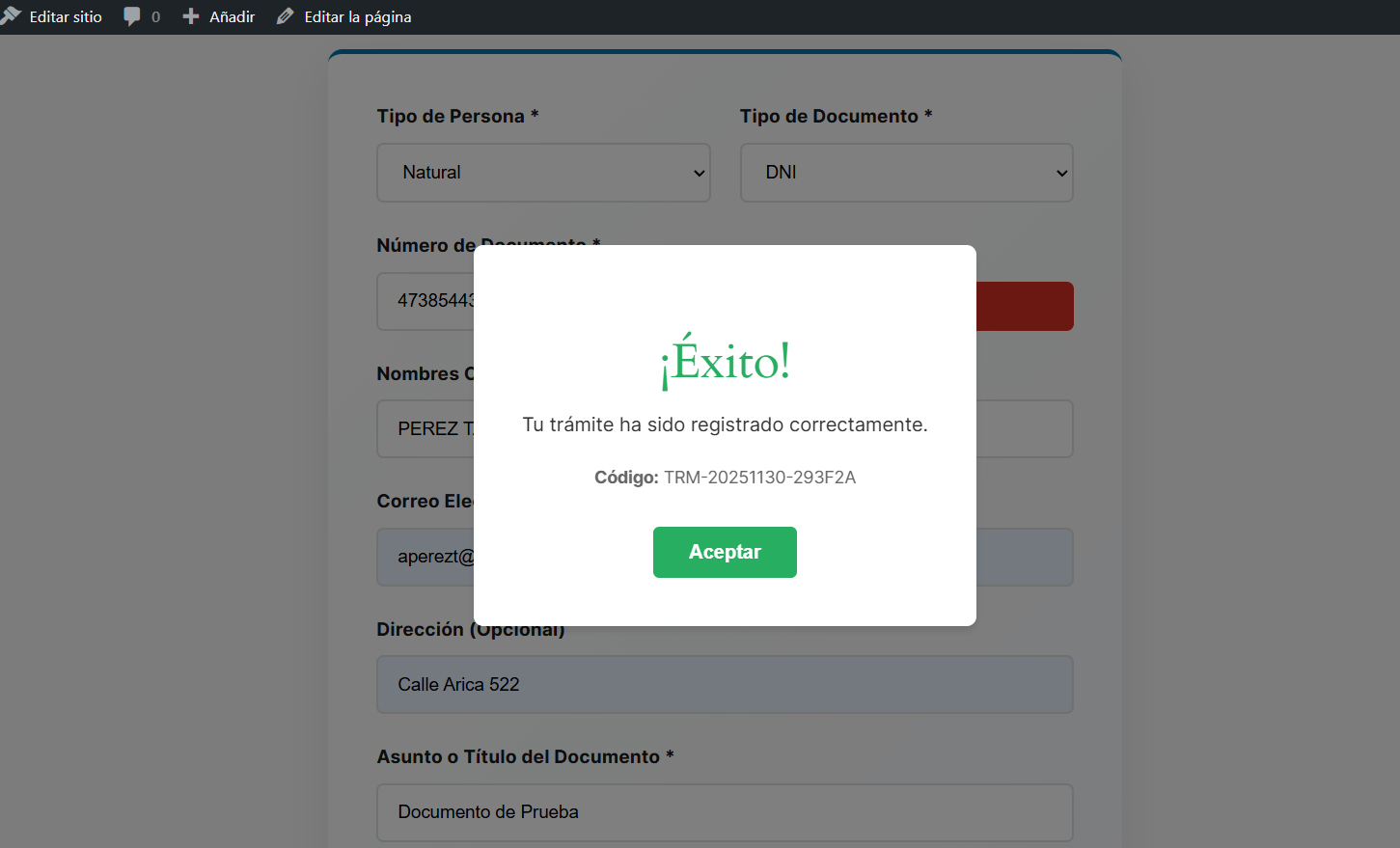 - Luego de creada la pagina ingrese al cuerpo y tipee o pege el texto [tramites_form]