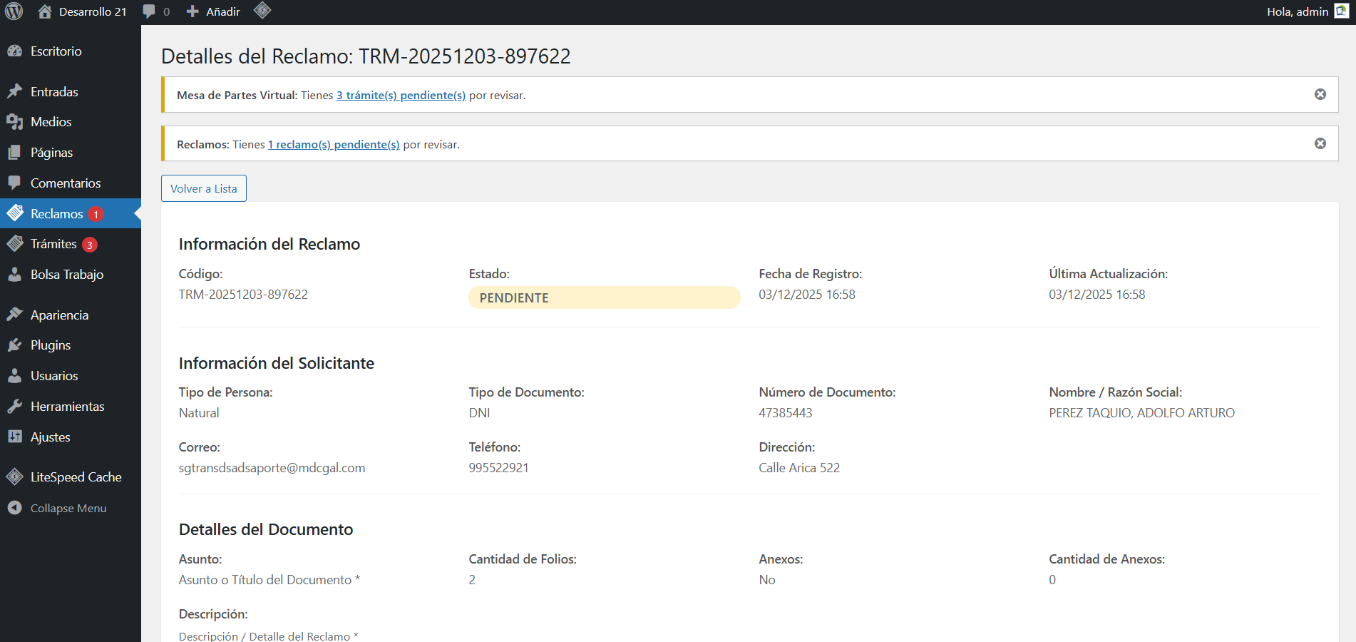 Cada vez que se registra un documento nuevo en el sistema, este se crea con el estado PENDIENTE, la cantidad de documentos pendientes se muestra como alerta en el Menu Trámites